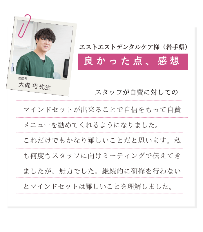 「スタッフ全員の共通理解×患者様への伝達」 この重要性が理解できこれを、継続することで医院の成長と患者満足度に直結できると考えている。