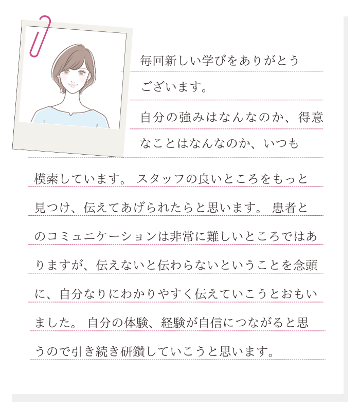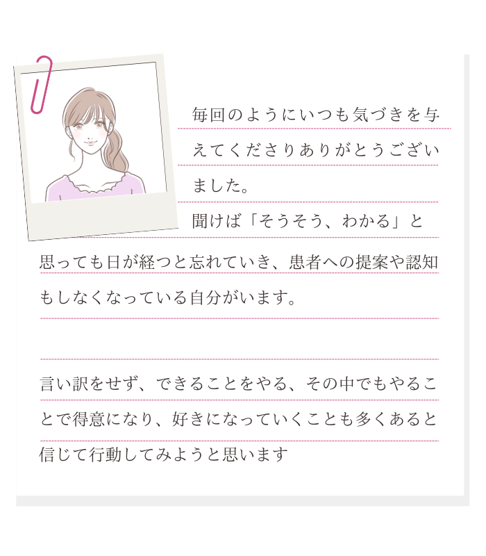 1回の単発でなく、継続的にディスカッション、モチベーションキープを測るために3ケ月ごとにLIVEでの参集研修を行って頂き、その都度、目標や課題を出して頂いておりました。 今まで様々な院内研修を行ってきましたが少し期間が経過すると長続きしなく、またリセットの状態になり うる事が多々ありました。