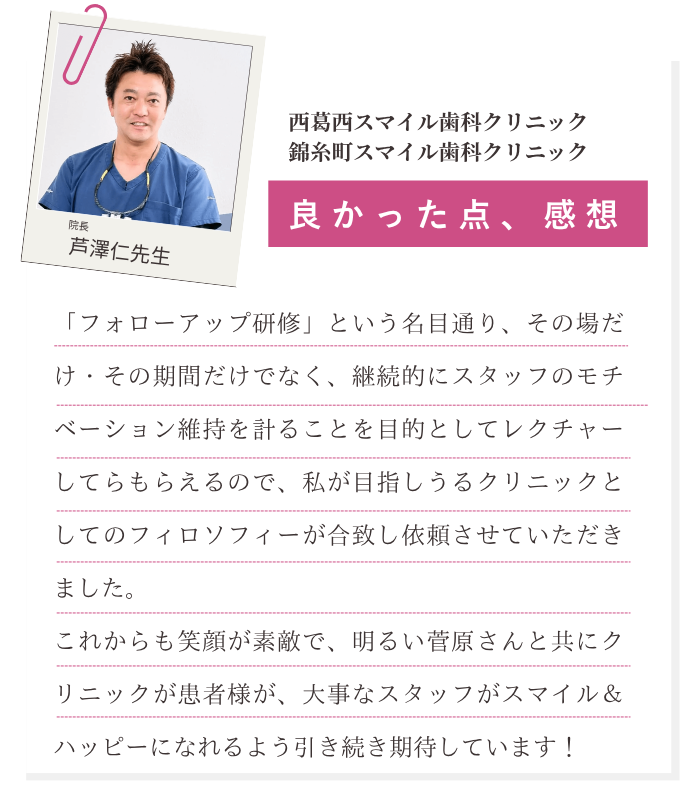 この研修によりホワイトニングだけでなく自費治療や物販売り上げ向上にも繋がり、それが患者様のモチベーションアップに繋がっている。